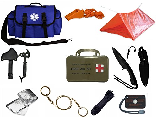 Ultimate Arms Gear Deluxe Blue Emergency Survival Rescue Bag Kit; Signal Mirror, Polarshield Blanket, Knife Fire Starter, Wire Saw, 50' Foot Paracord, Camping Tube Tent, Whistle & First Aid Kit