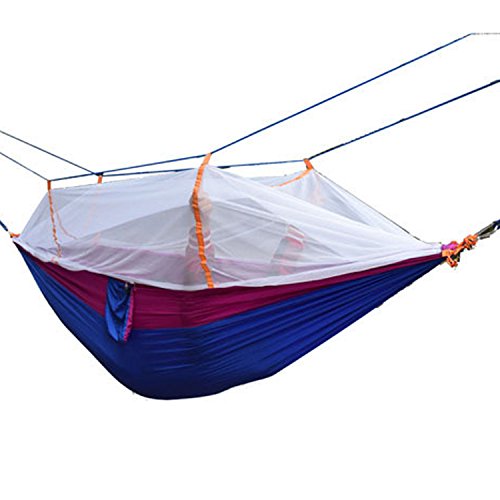 All images of HMLifestyle-Lightweight Portable Double Camping Hammock With Mosquito Net(With Hammock Tree Straps),Parachute Cloth Hammock For Outdoor Camping Holiday Beach (purple and blue)