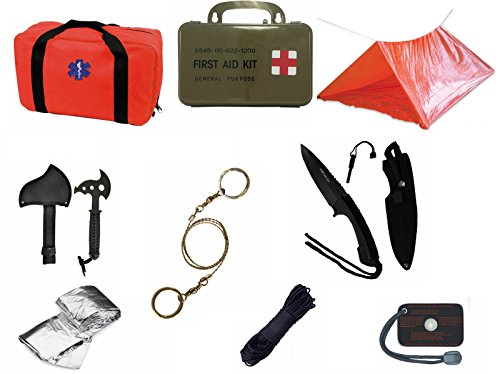 Ultimate Arms Gear Orange Emergency Survival Rescue Bag Kit; Signal Mirror, Polarshield Blanket, Knife Fire Starter, Wire Saw, 50' Foot Paracord, Camping Tube Tent & First Aid Kit